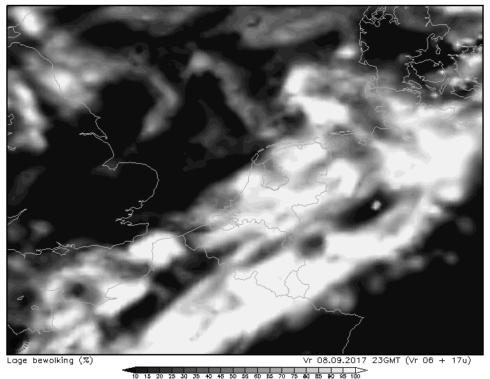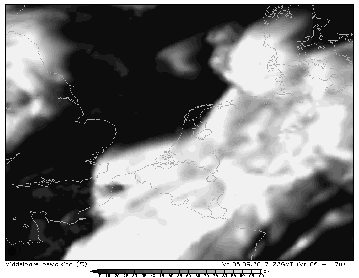 De beste kansen zijn weggelegd voor het uiterste noorden van Nederland. Met voorop de Waddeneilanden. Kort na middernacht middernacht zou daar de middelbare bewolking moeten zijn verdwenen volgens onderstaande verwachting van het Hirlam-model. (kaartje voor 1 u vannacht)